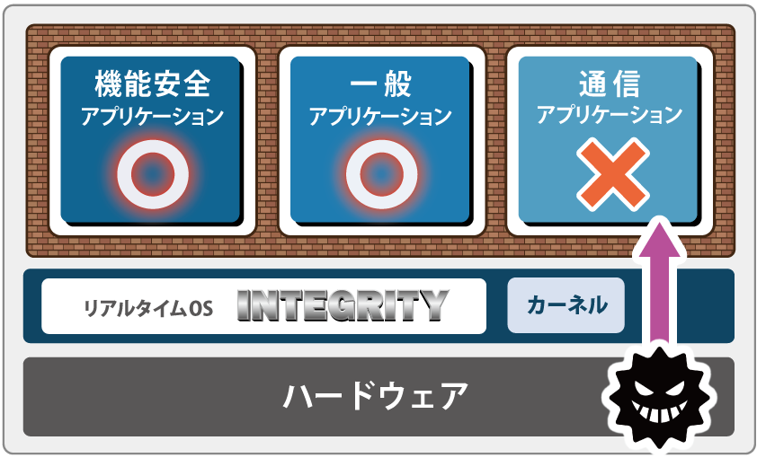 リアルタイムOS「INTEGRITY」は、アプリケーション実行中にメモリ破壊が発生してもカーネルや他のアプリケーションに影響を与えず、安全にシステムを実行できる世界一堅牢なOSです。アプリケーションを仮想アドレス空間単位で分離・保護することで、外部からの侵入や攻撃があっても、システムに一切の影響を及ぼすことなく安全にシステムの実行が可能です。
