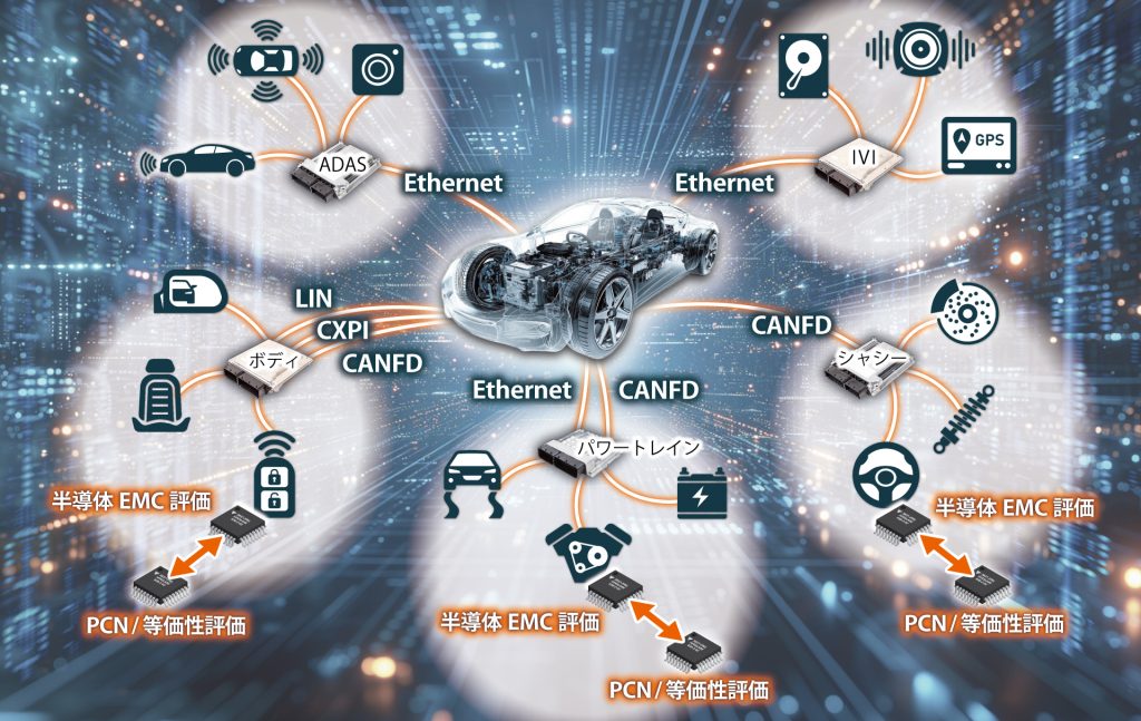 対応規格は、CAN、CAN-FD、LIN、CXPI、Automotive Ethernet(10BASE-T1S〜マルチギガ)など幅広く、SDV化が進む中で高度化する通信要件に対応できる体制を整えています。また、通信品質の確保に不可欠なEMC評価、設計変更やサプライヤ差異を確認する等価性評価、ネットワークの物理レイヤ性能を検証するPCN(Physical Communication Network)評価など、多面的なアプローチで車載通信の堅牢性と妥当性を確認できます。