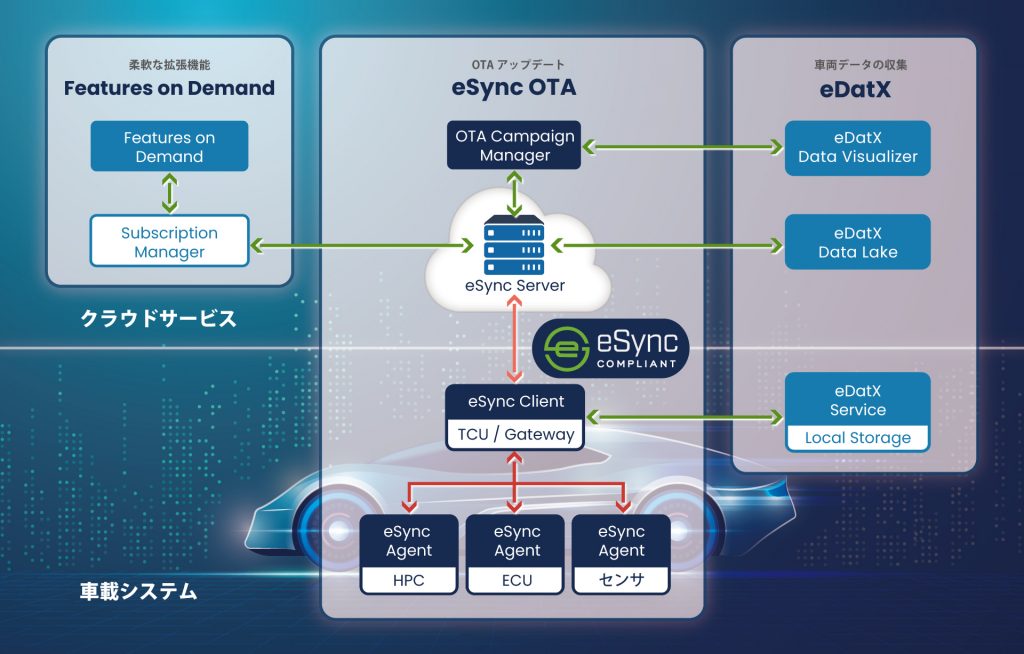 「eSync OTA」は、世界で数百万台の導入実績を持つ先進的な車両OTAソリューションです。サイバーセキュリティ法規UN-R155/156に準拠し、ゼロトラストモデルで最高クラスのセキュリティを実現。特許取得の適応型デルタ圧縮技術により効率的なデータ更新が可能です。