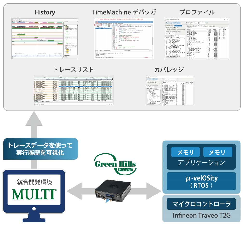 統合開発環境「MULTI」は、プログラミングからデバッグまでを統一GUIでサポートし、複雑なプログラム動作を可視化する「History」や問題原因を逆再生で特定する「TimeMachine」を搭載。モデルベース開発などのサードパーティーのツールとの連携も可能です。